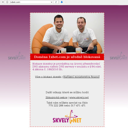 Pro zablokování webu jsme zvolili přesměrování DNS záznamů. Naše DNS servery pro dotaz na zakázaný web namísto správné (internetové) adresy vrátí záznam s adresou ukazující na zablokování webu. Vám se místo očekávané stránky zobrazí naše hláška (viz obrázek vpravo - zablokovaný web 1xbet.com dne 26.7.2017).
