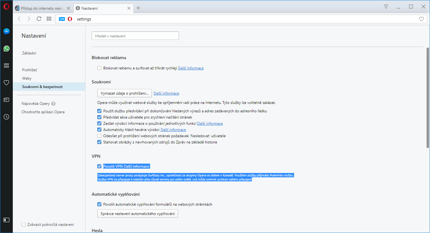 Znáte prohlížeč Opera? V něm obejití takového zákazu je otázka dvou kliknutí v Nastavení. Stačí jen zapnout integrovanou VPN. A rázem nejste z pohledu prohlížeče v České Republice.