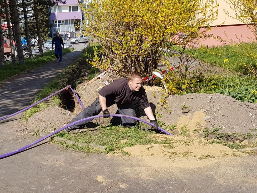Jiří Rejha při tahání chrániček pro optické kabely na sídlišti Pražská.