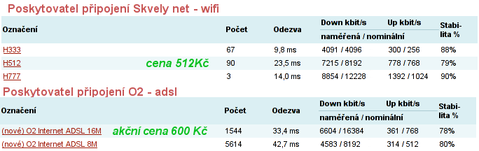 Nejdříve obligátní srovnání skvely.net vs O2 (podle serveru rychlost.cz - data ze dne 6.1.2011)