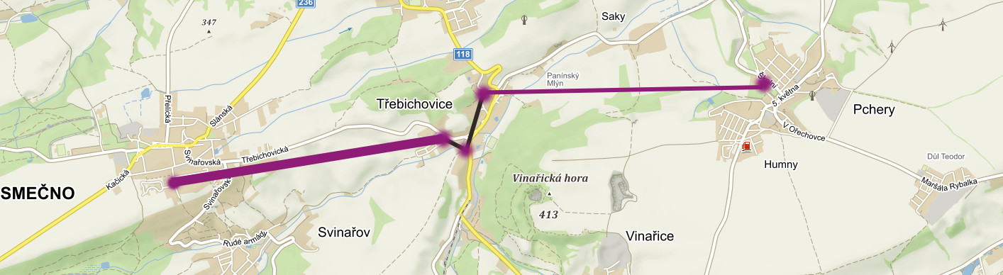 Samozřejmě, mohli jsme k posílení přistoupit metodou “většího kladiva”, tedy výměnou spoje Pchery--Třebichovice za novější a tím posílit napojení Pcher. Délka spoje Pchery - Třebichovice je 2.5km, což je rozumná vzdálenost. Nicméně Pchery jsou napojeny do sítě delším skokem a to komplikuje možnosti přivedení kapacitního spoje. Pro vzdálenosti větší jak 3.5km se obtížně vedou gigabitové trasy bez zálohy, a to ještě takové, které by zvládly přenos pro dvě obce (Pchery a Třebichovice).