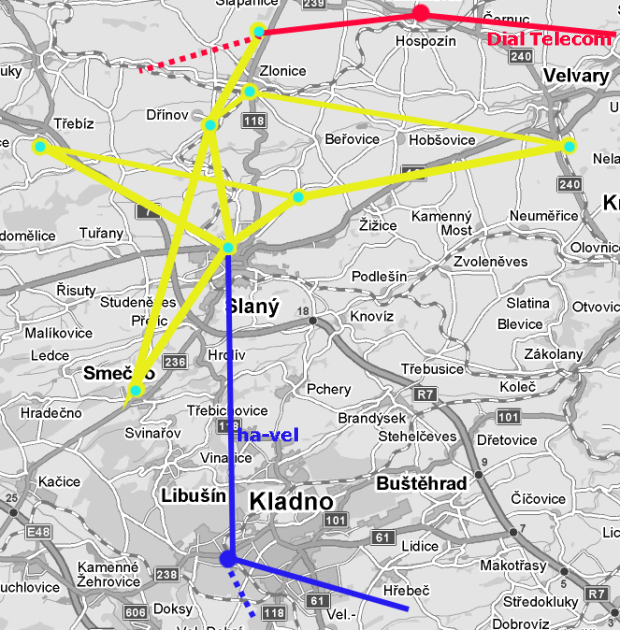 Naše síť nedisponuje pouze jedním spojem od většího providera jak bývá u většiny lokálních providerů zvykem, ale máme dvě nezávislé připojení od různých providerů, vyvedených do různých lokalit. Jedno takové místo je slaný-ráj, kde končí mikrovlnný spoj od společnosti ha-vel a druhé novější se nachází kousek za Zloniciemi, kde jsme napojeni přímo optickým vláknem na společnost Dial Telecom.